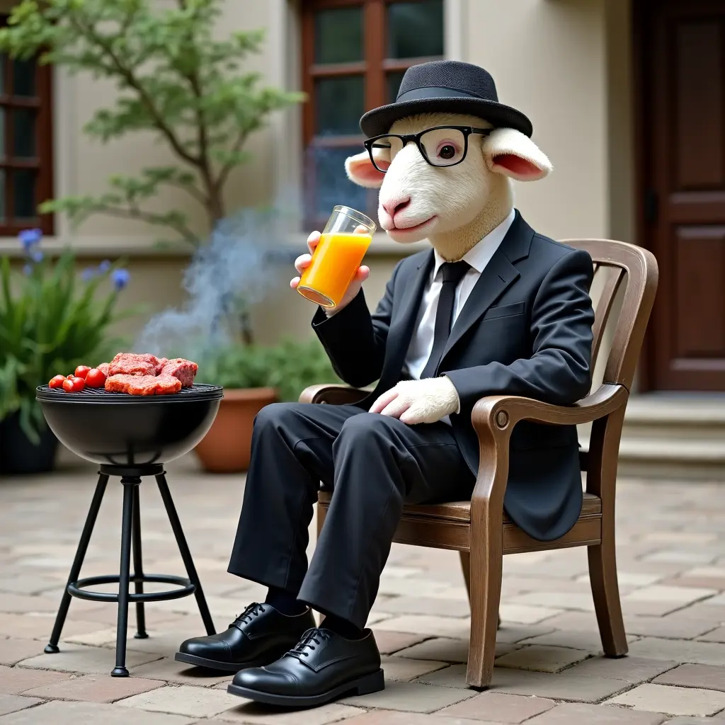 خاروف يجلس ع كرسي في الفصاءويقوم بشواء اللحمه ويشرب العصير  ويرتدي قبعه وطقم رسمي وحذاء اسود ونظارات