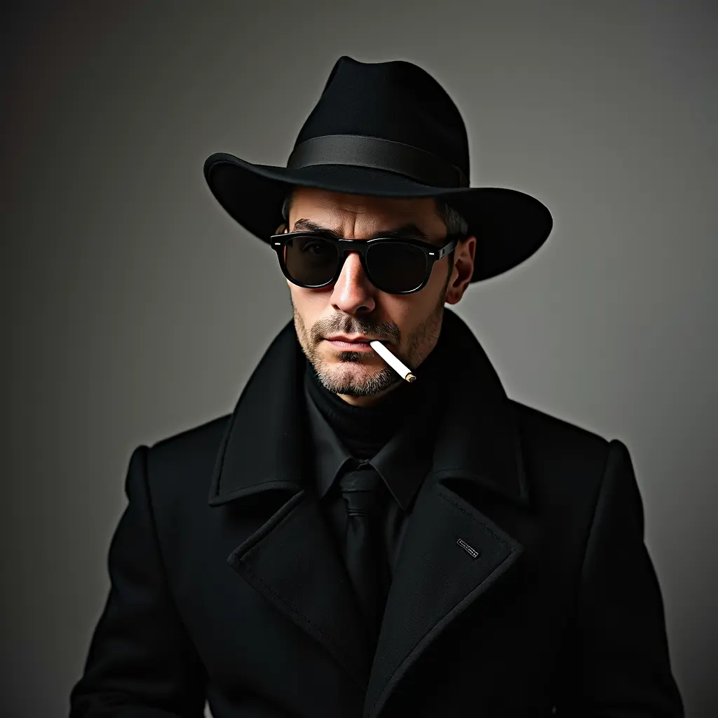 رجل فخم يرتدي بالطو اسود وقبعة سوداء ونظارة شمسيه ويشرب سيجاره