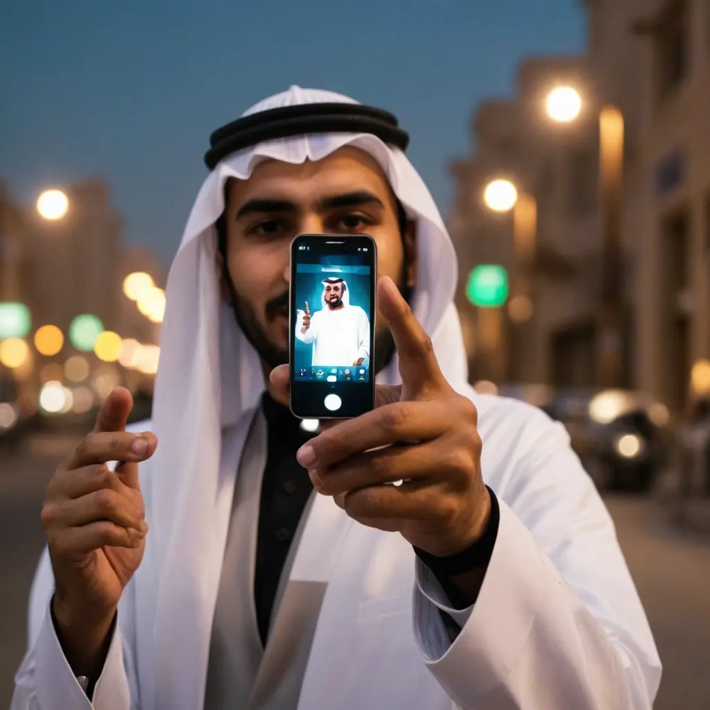 صور لشخص سعودي يقوم بحمل هاتف محمول ويوجهة ناحية الكاميرا وخرج إضائة من الهاتف المحمول