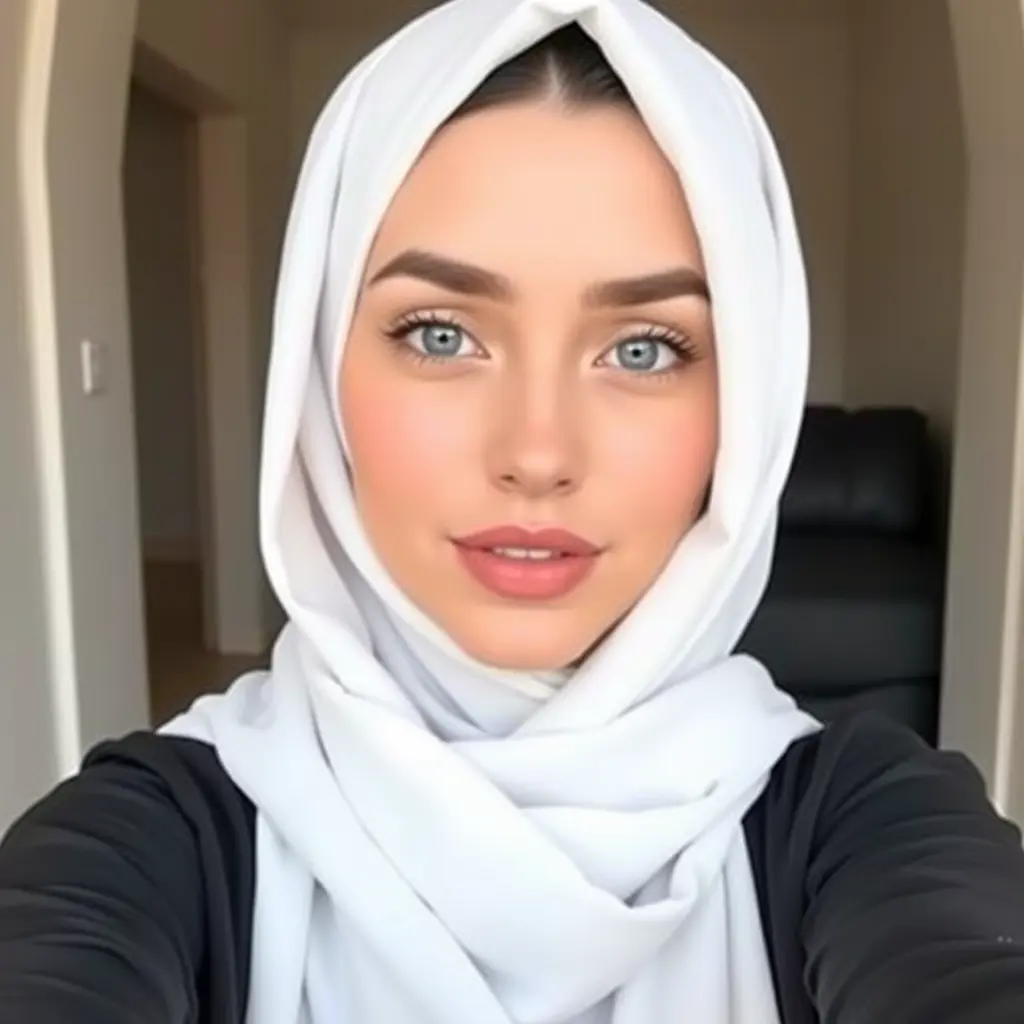 انتى جميلة جدا، بملامح عربية، بيضاء البشرة،فمها طبيعي دون الوان وروج،ووجهها دائري ليس مستطيل الشكل، ترتدي حجاب باللون الابيض، وعباية باللون الاسود،، تاخذ صورة سلفي