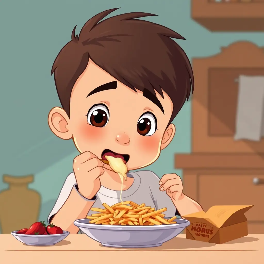 صورة كارتون لولد يأكل الطعام من أمامه بيده اليمنى