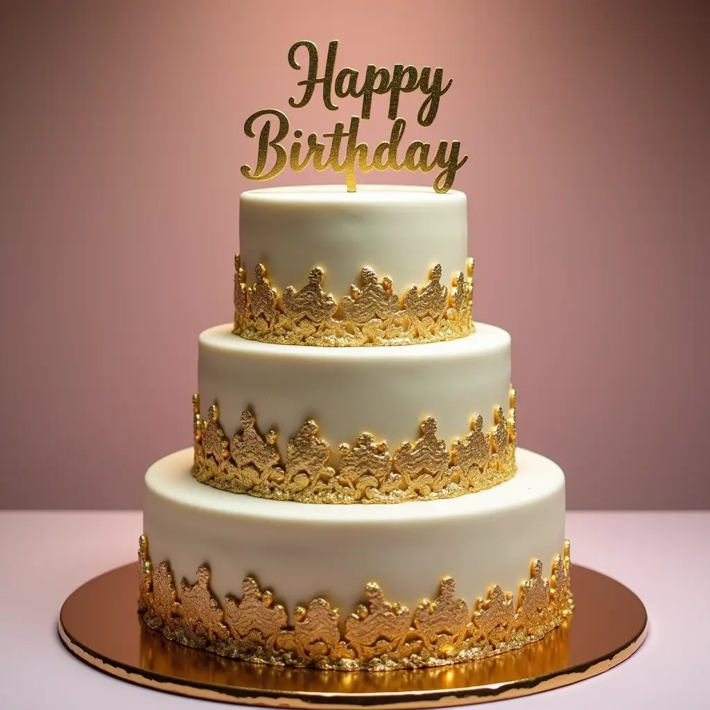 كعكة عيد ميلاد ثلاثة أدوار مزينة الذهب و مكتوب عليها happy birthday sameh