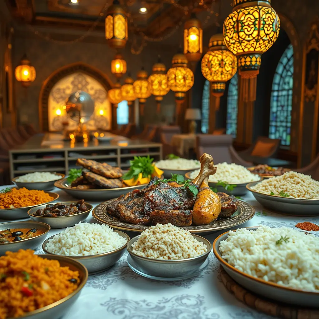 الصورة تعرض سفرة رمضانية فاخرة مستوحاة من المطبخ اليمني الأصيل، حيث تتزين المائدة بأطباق شهية من لحوم الحنيذ الغنية بالنكهات، إلى جانب قطع اللحم الطرية المشوية بعناية. يكتمل المشهد بأصناف الأرز التقليدية مثل المندي، الزربيان، وأرز الزرب، التي تفوح منها روائح التوابل الشهية. الإضاءة الدافئة والفوانيس الشرقية المعلقة تضفي أجواءً روحانية واحتفالية، مما يجعلها وليمة مثالية للإفطار في رمضان.