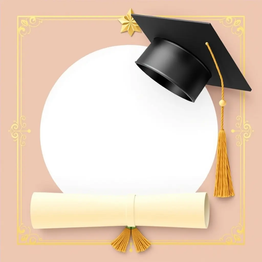 بطاقة، إطار من قبعة التخرج واللفافة، وسط مفتوح، عناصر شرابة ذهبية، رموز أكاديمية.