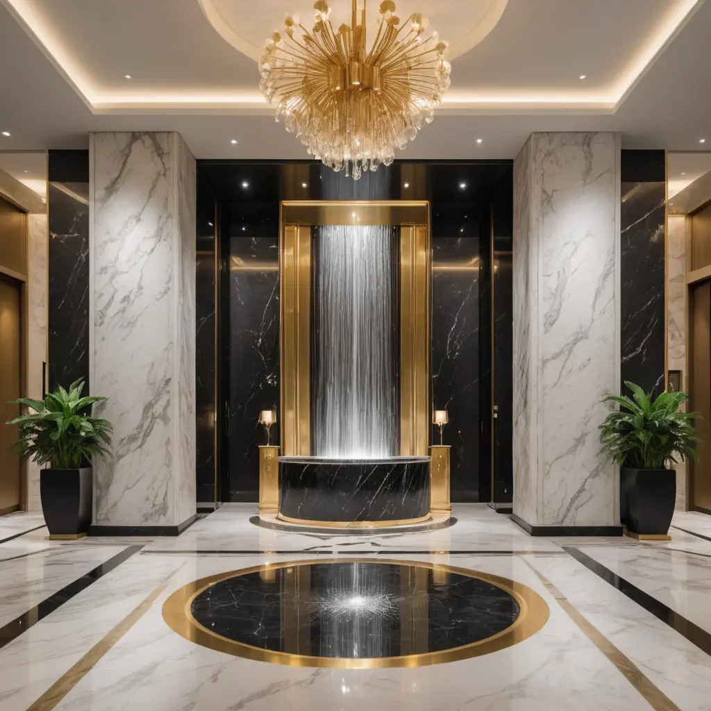 مدخل فندق فخم مع شلال مائي، واجهة براقة من الزجاج والحديد والرخام، تصميم عصري فخم