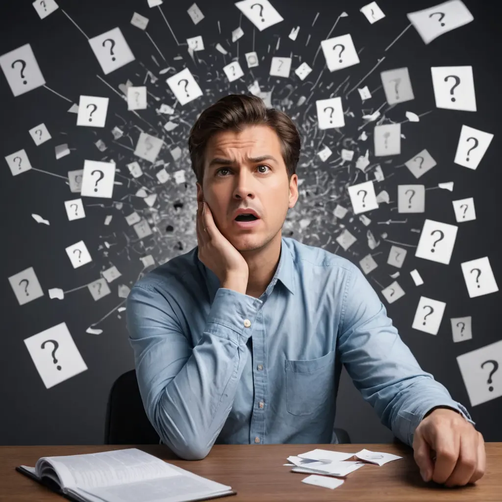 صوره انسان عقله مشتت وغاضب والخلفيه حوله مبعثرة ويدور بها عدة اسئلة