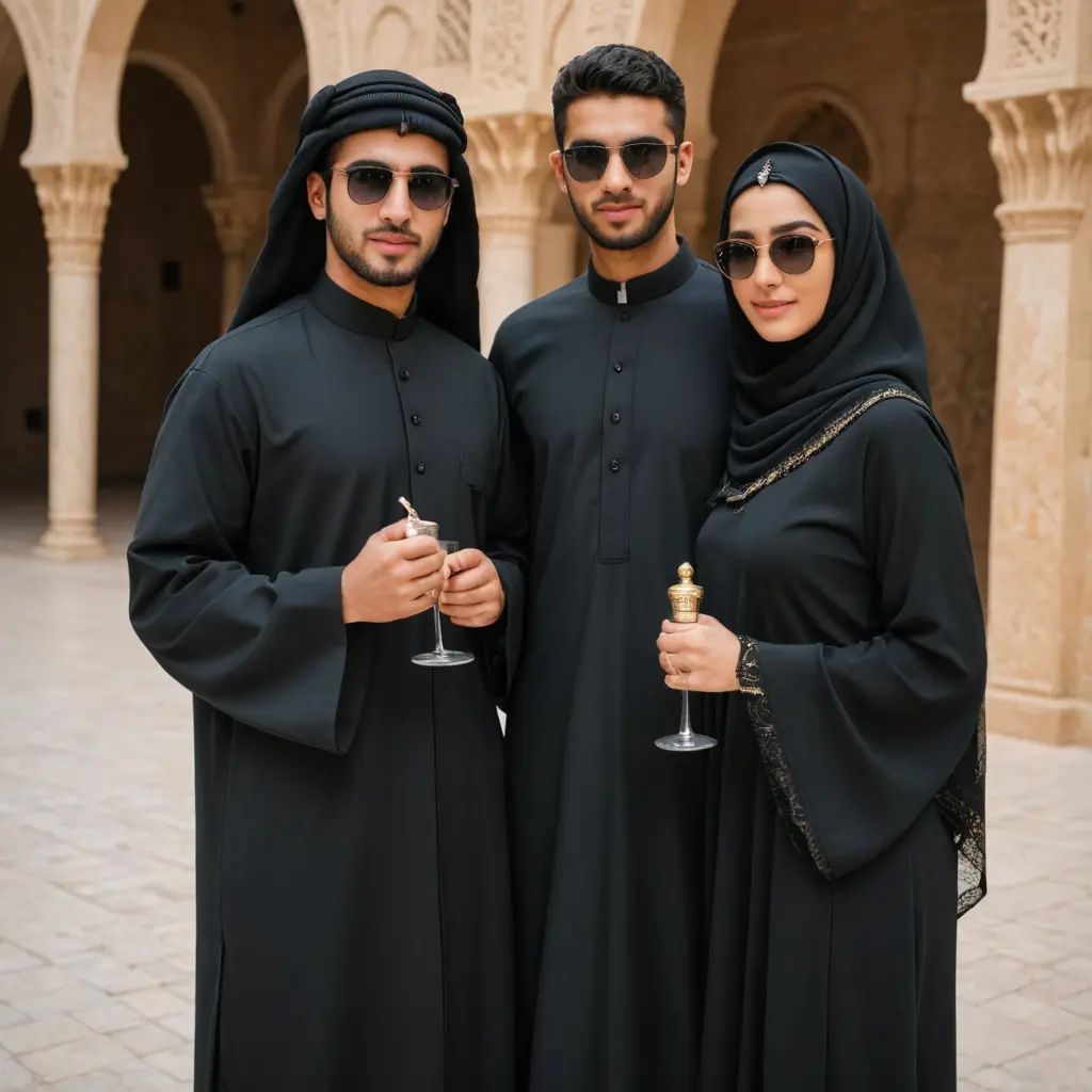 شاب عربي و فتاة عربية ترتدي عباية سوداء و محجبة يرتدون نظارات شمسية من نفس النوع و يمسكون بايديهم نظارة ثانية من نفس النوعية