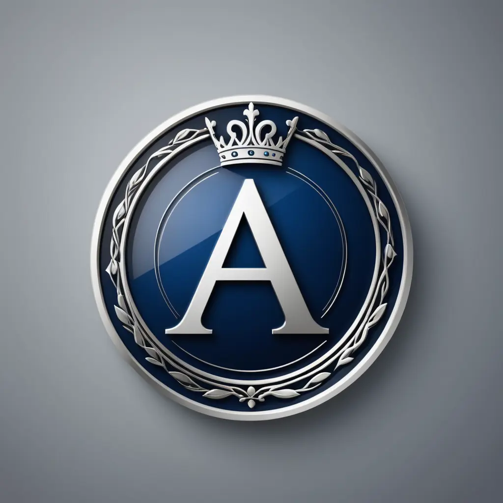 شعار أنيق لشركة إكسسوارات، حرف A داخل دائرة مع تاج، باللون الفضي والأزرق الياقوتي