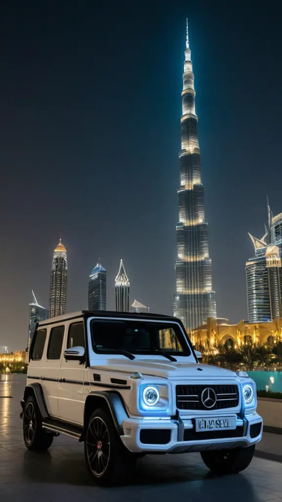 سيارة مرسيدس g class لون ابيض واسود  أمام برج خليفة في الليل مع رقم لوحة باسم  (درع )  مع إنارة زرقاء