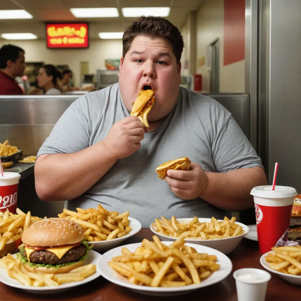 رجل سمين ياكل بنهم شديد وامامه كمية متنوعة من الطعام الجاهز فى مشهد مقزز يحذر من السمنة والاكل السريع ومكتوب على الصورة من فوقه "كل مرة تبدأ دايت تمل وتوقف بعد أيام "