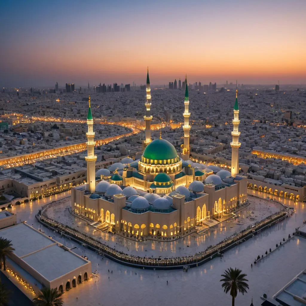 المسجد النبوي الشريف بدقة عالية مع وجود أشجار النخيل بشكل مميز