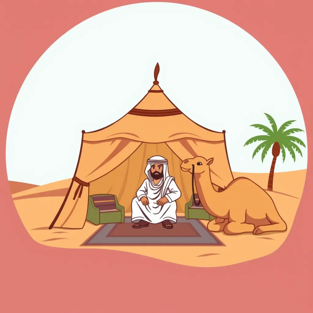 شعار.خيمة بدوية بيت شعر في جلسة عربي و رجل بزي عربي عكال وشماغ شيخ قبيلة و جانب جمل جالس ونخيل كارتونية كلاسيكي تراثية