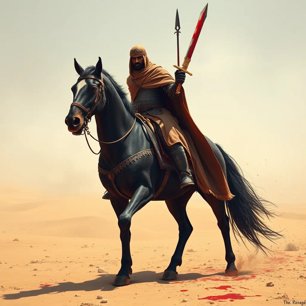 فارس عربي على حصان في صحراء يحمل سيف مدمى