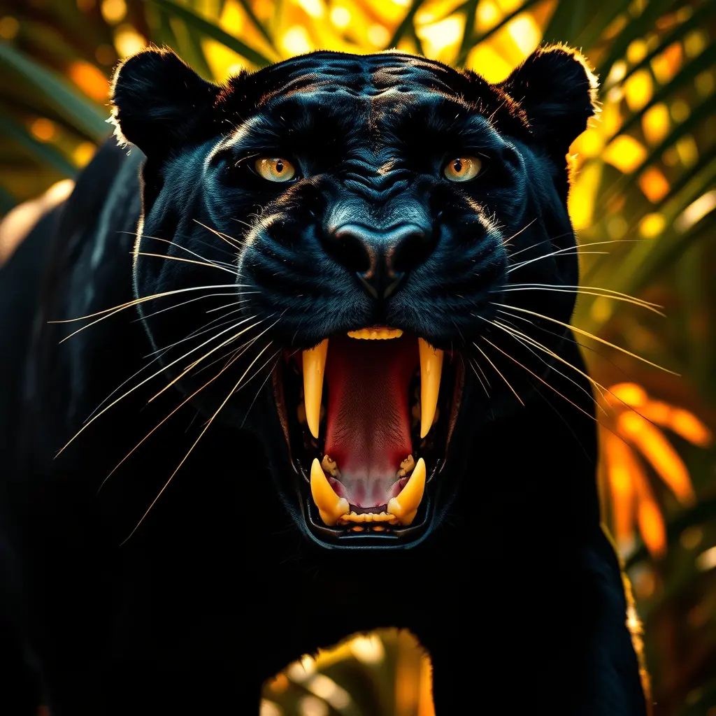 فهد أسود بزئير شرس وسط غابة استوائية مضاءة بأشعة الشمس الذهبية، حيث تبرز عضلات وجهه المشدودة وأنفاسه المتوترة، مع فرو أسود كثيف تكسوه لمعة زرقاء باهتة تتناثر عليها خدوش حمراء خفيفة، بينما تنعكس أضواء الشمس على عينيه الذهبيتين الحادتين، اللتين تلمعان ببريق عدواني، وتبرز أنيابه الطويلة المصفرّة من فمه المفتوح على وسعه، محاطًا بخلفية ضبابية من أوراق خضراء وبرتقالية تتخللها أشعة الشمس المتسللة، مما يمنح المشهد طابعًا دراميًا يوحي بالقوة، والسيطرة، والتهديد الكامن في صمت الغابة.