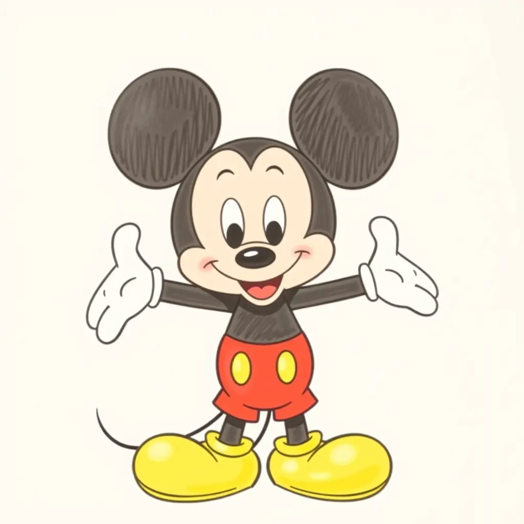 رسم كرتوني لشخصية ميكي ماوس الأصلية من إنتاج ديزني. ميكي هو فأر أسود بملامح كرتونية مميزة، رأسه دائري كبير مع أذنين دائريتين بارزتين، ووجهه بلون بيج فاتح. عيناه كبيرتان بيضاوان مع بؤبؤين سوداويين، أنفه أسود صغير وفمه مبتسم. يرتدي سروالًا أحمر بأزرار صفراء دائرية، وقفازات بيضاء، وحذاءً أصفر كبير الحجم. يكون ميكي واقفًا في وضعية T-pose (الذراعان ممدودتان إلى الجانبين والساقان متباعدتان قليلاً)، مع خلفية بيضاء. يجب أن يكون الرسم بسيطًا ويحافظ على التصميم الكلاسيكي المعروف لميكي.