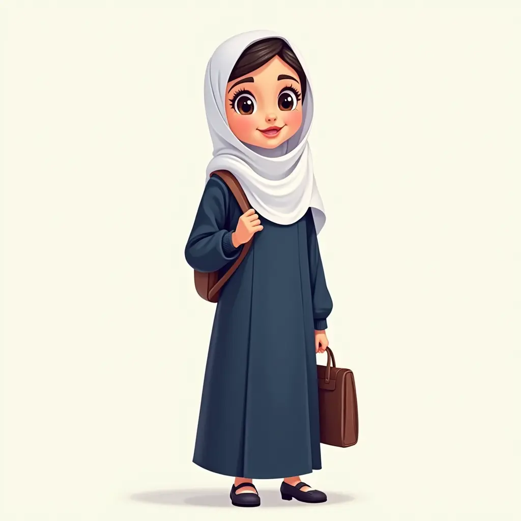 فتاه عربيه بلباس مدرسي عماني ازرق غامق طويل وقميصة بيضاء وحجاب ابيض وترتدي حقيبه مدرسية انميشن كرتوني وليس حقيقي