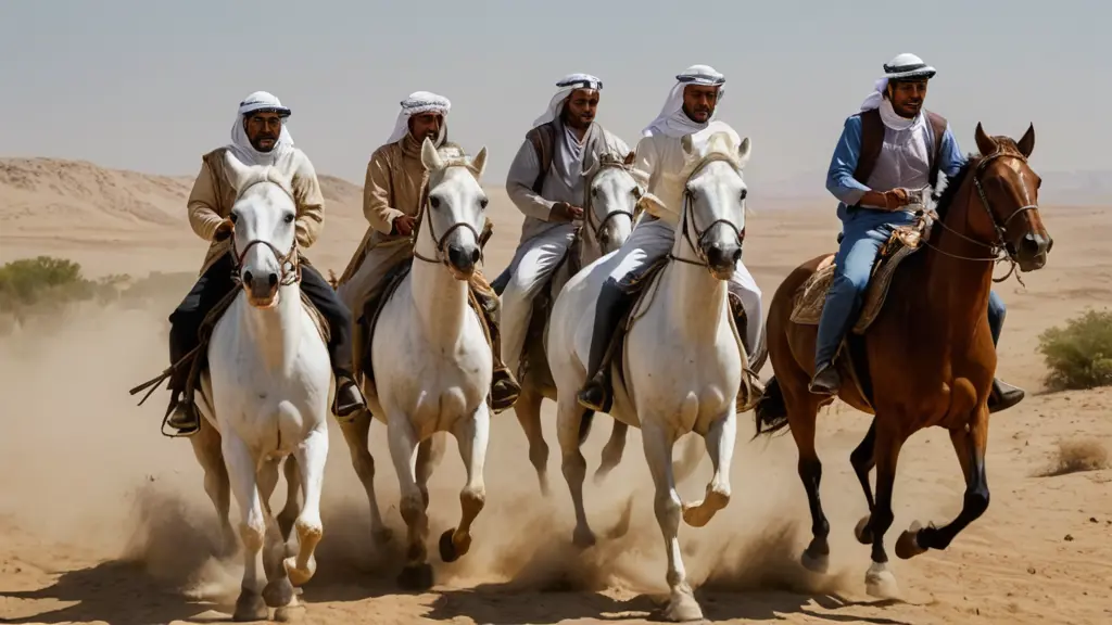 خمس فرسان بدو على ظهر خيولهم بيضاء اللون وهي تركض مواجهة للكاميرا ومرسومة بالالوان الزيتية
