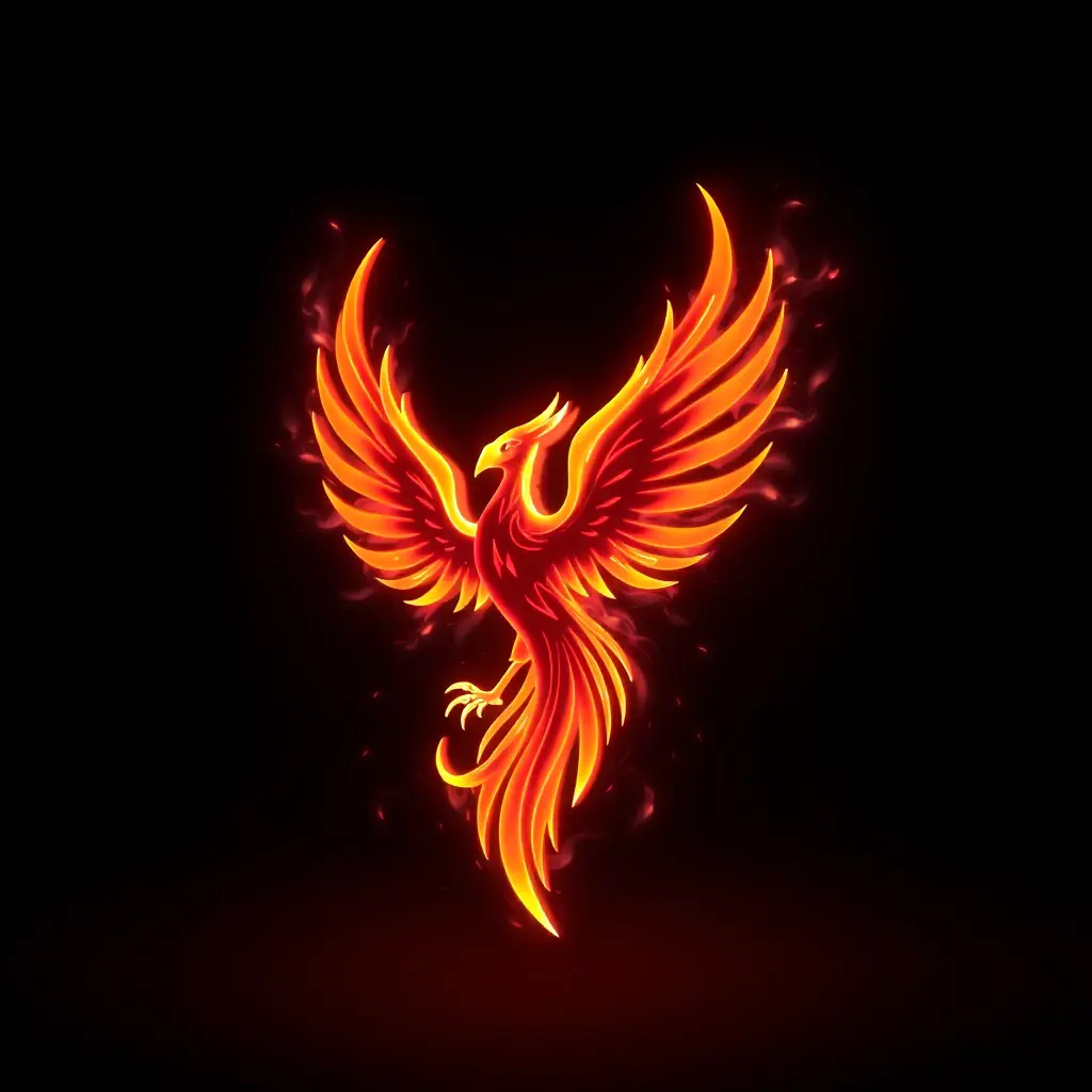 شعار طائر العنقاء يخرج من نيران رقمية، بمظهر مستقبلي وألوان نيون مضيئة، ثلاثي الأبعاد
