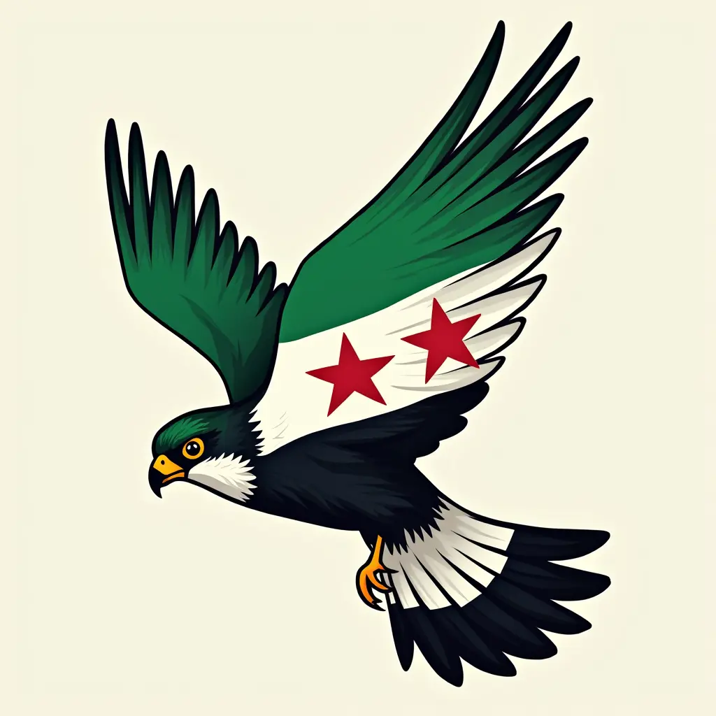 اصنع لي صورة طائر الشاهين مع علم الثورة السورية يبدو كشعار العلم اخضر ابيض اسود وثلاث نجمات باللون الاحمر بدقه