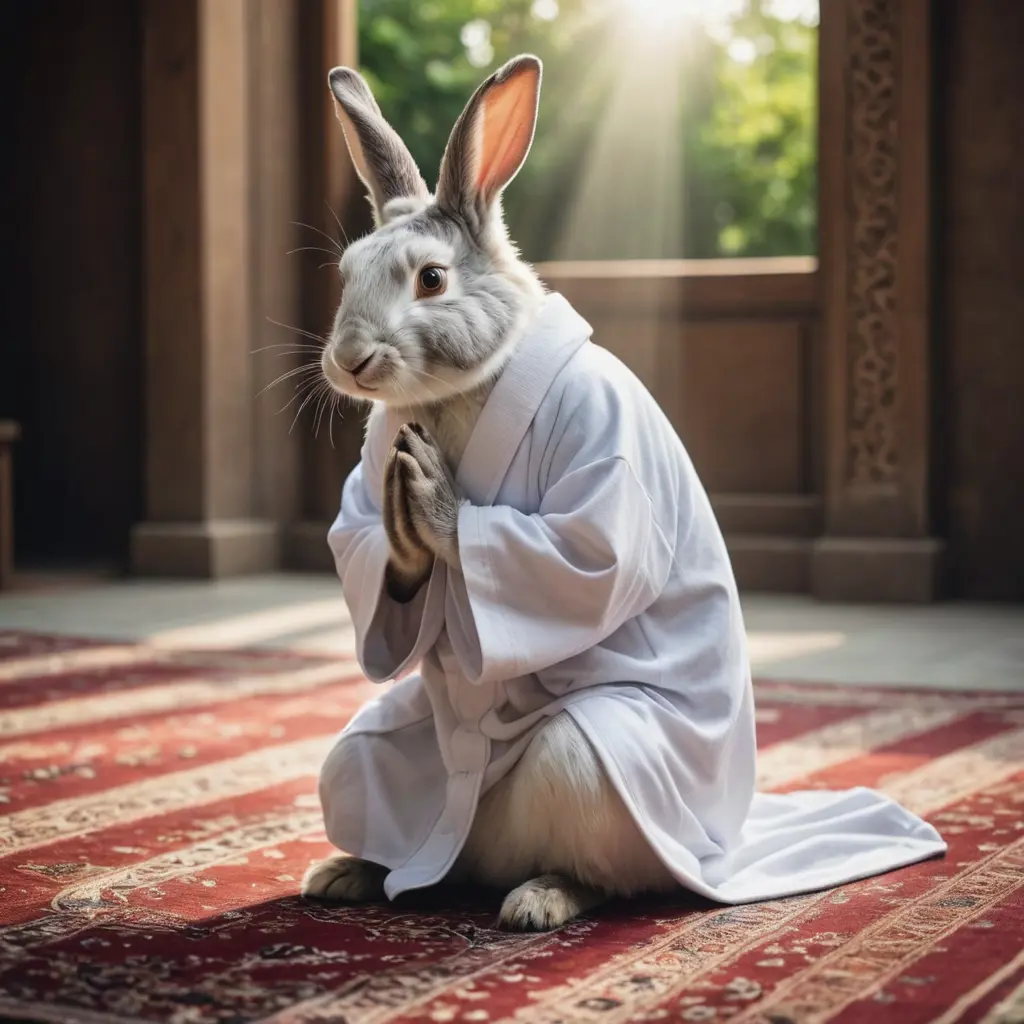 صورة ارنب يصلى صلاة المسلمين ويرتدى جلباب ابيض