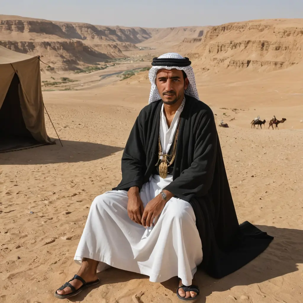 رجل بدوي في محافضة مارب يوجد خلفه عرش ملكة سباء
