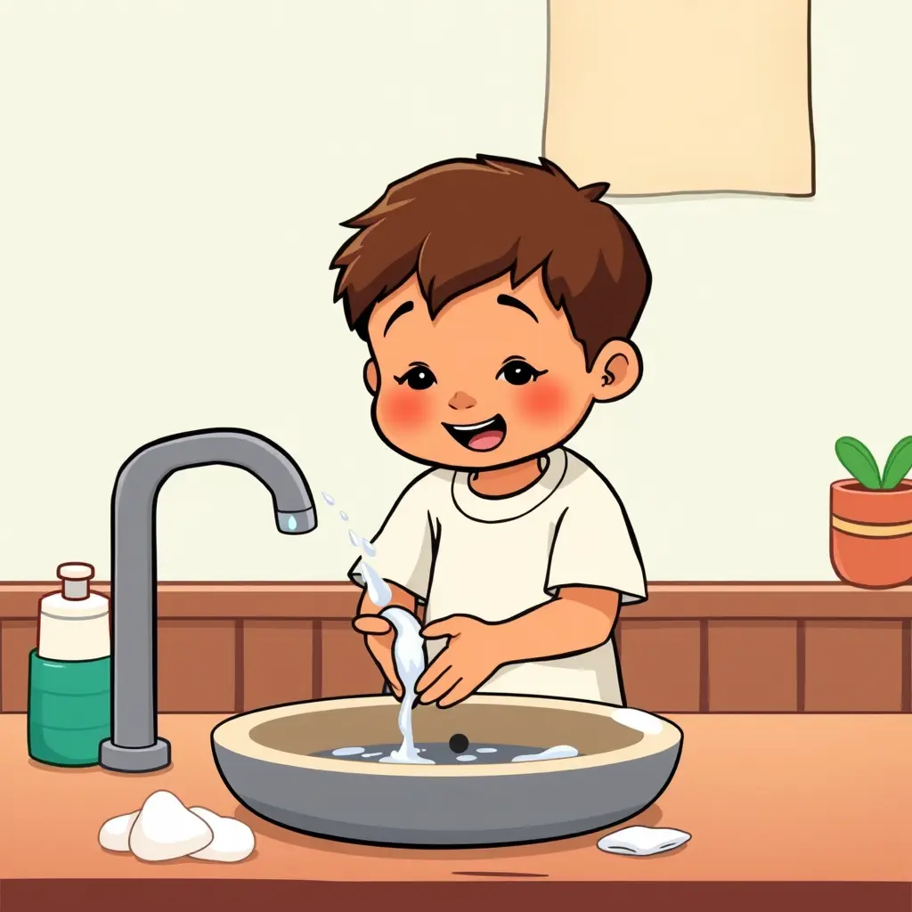 مشهد كرتوني يعرض طفلًا يغسل يديه بالماء والصابون