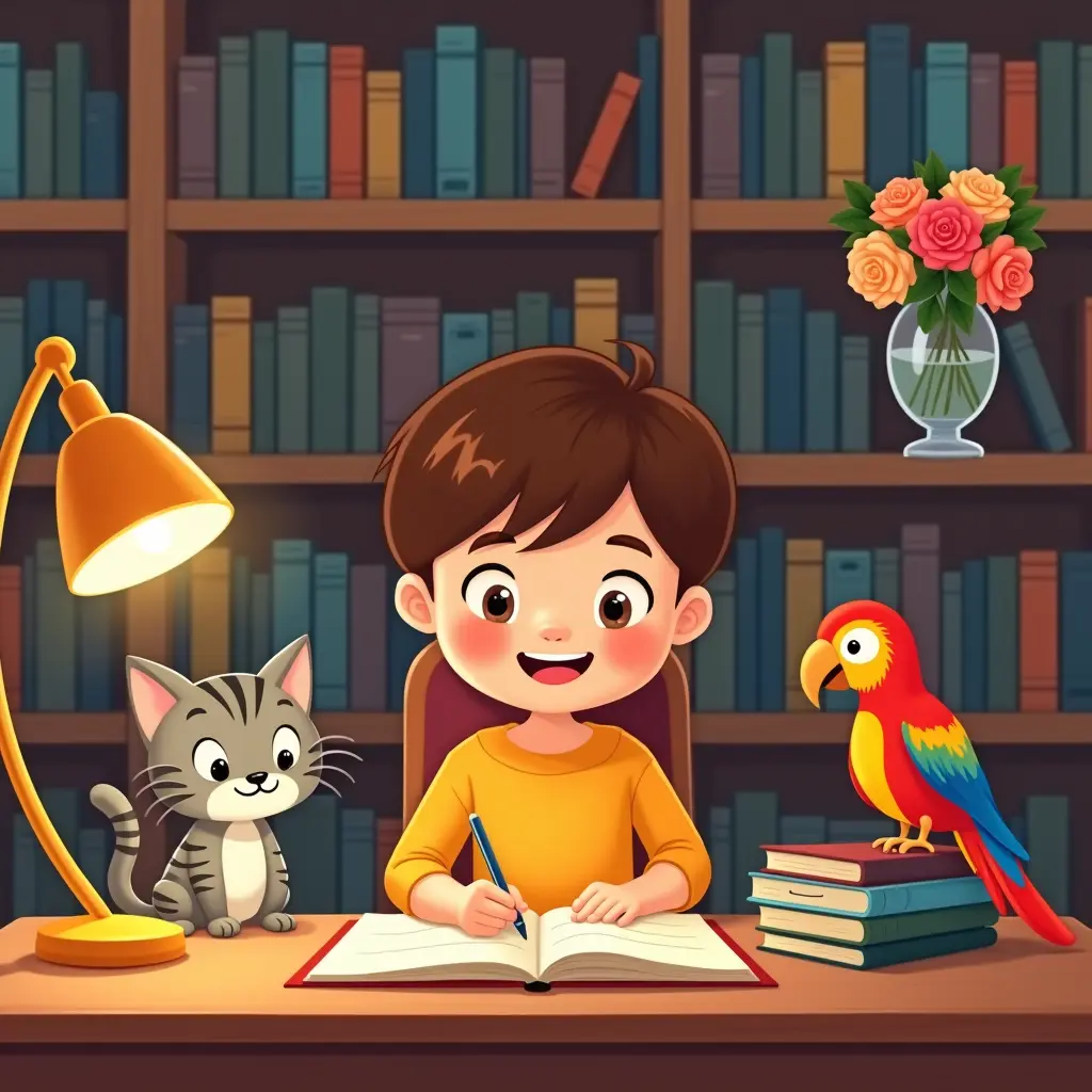 طفل مبتسم يجلس على مكتب خشبي دافئ اللون، يكتب بحماس في دفتر مفتوح. إضاءة دافئة من أباجورة صغيرة ذهبية اللون على طرف المكتب. قطة شقية رمادية مخططة تجلس بجانب الطفل، تمسك كتابًا بين مخالبها وتنظر بفضول. ببغاء ملون بريش أحمر وأزرق وأصفر زاهي يقف على كتف الطفل، منقاره مفتوح كأنه يتحدث. في الخلفية مكتبة خشبية كبيرة مليئة بكتب ملونة بأحجام مختلفة. على رف المكتبة زهرية زجاجية أنيقة تحوي باقة ورد متنوعة بألوان زاهية. الجو العام دافئ ومريح، مع ألوان باستيل هادئة تعطي إحساسًا بالراحة والمرح. أسلوب الرسم كرتوني بسيط مع خطوط ناعمة وتفاصيل لطيفة تجذب الأطفال. إضاءة ناعمة تنتشر في الغرفة، مع تركيز خفيف على وجه الطفل المبتهج. التكوين متوازن مع وضع الطفل في المركز والعناصر الأخرى موزعة بشكل متناسق حوله.