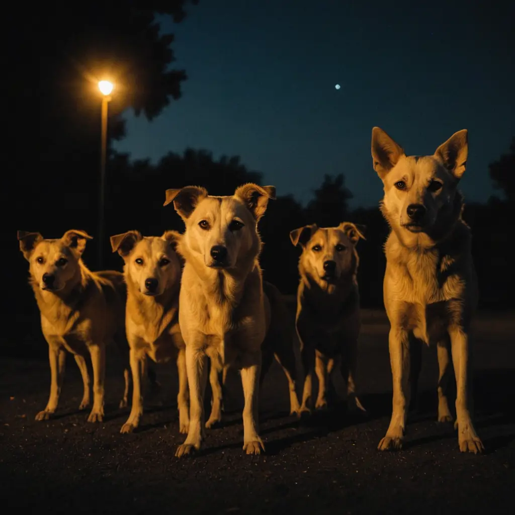 مجموعة كلاب ضالة في الظلام عيونها مضيئة