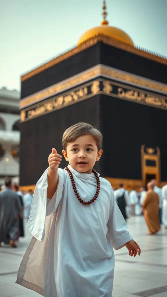 طفل يلبس جلباب يلعب حول الكعبة وبيده سبحة