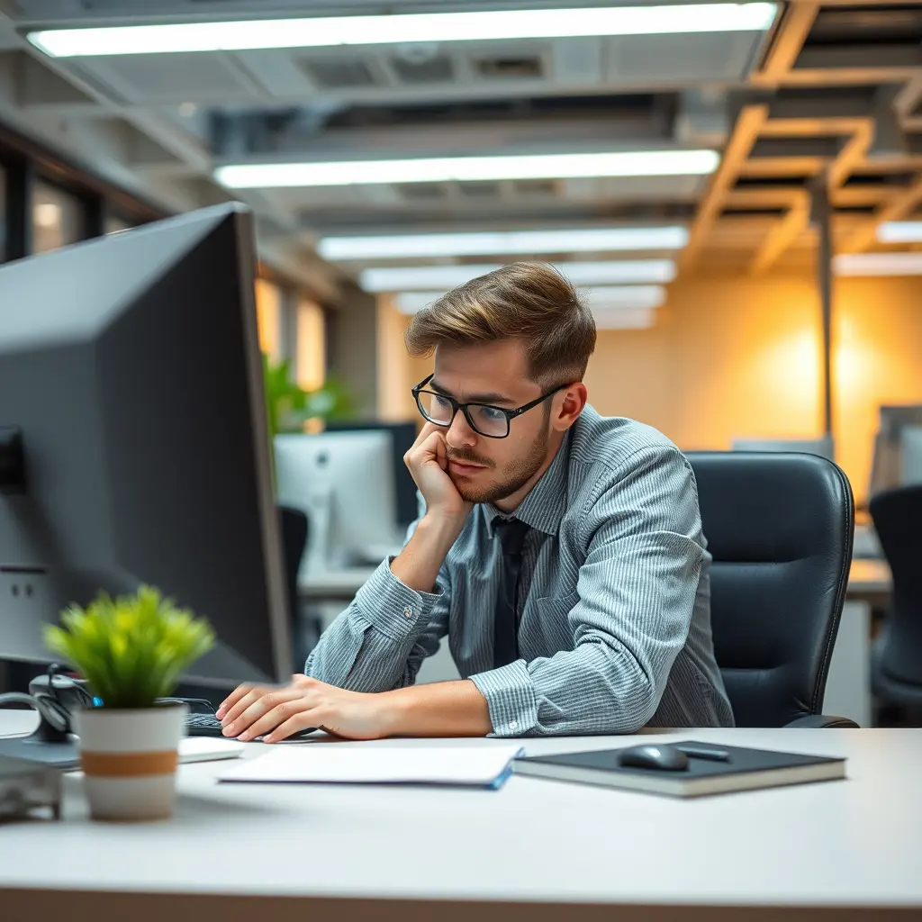 صوره عن شخص قاعد يشتغل في مكتب، ولاكن هو مرهق