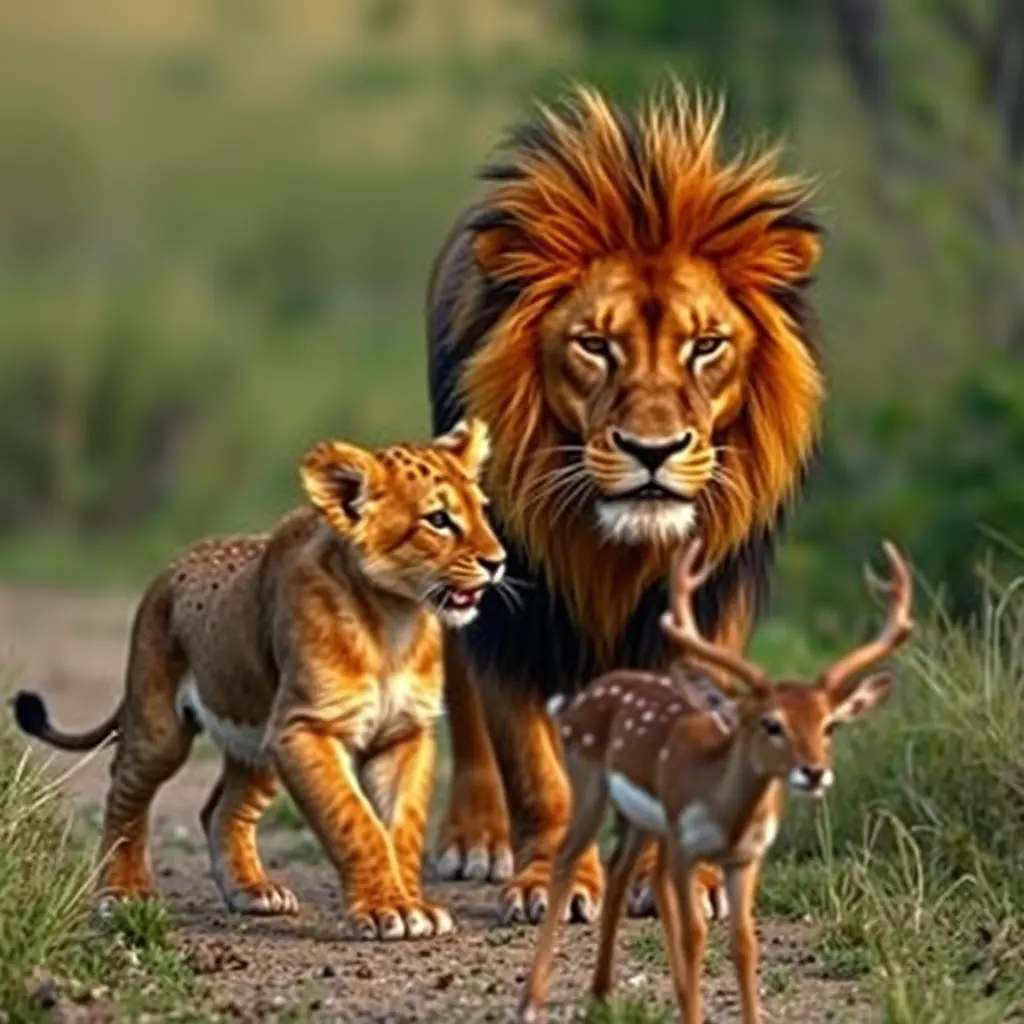 صوره لشبل اسد مع ابوه الاسد يمشيان فجاة يريا قطيع غزلان يمر امامهما وقرر الشبل ان ينقض علي الغزلان
