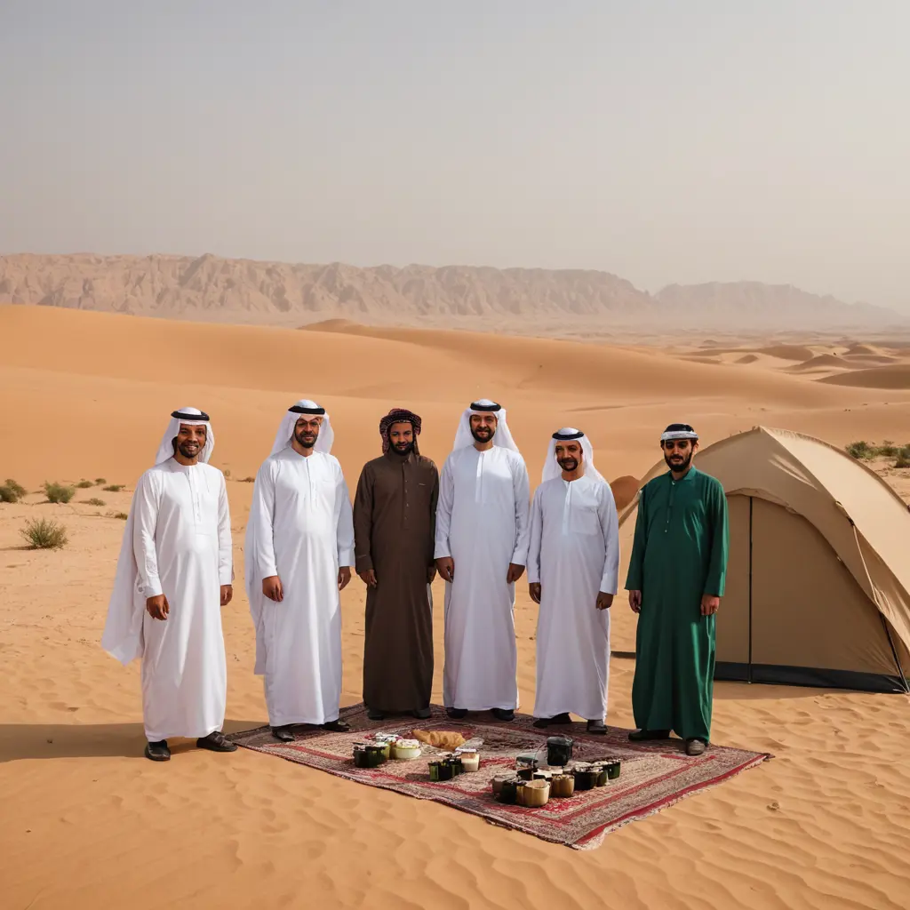 ثلاث رجال سعوديون يقفون مع ضيفهم في الصحراء وخلفهم خيمه يضيفون ضيفهم في القهوه العربيه والتمر