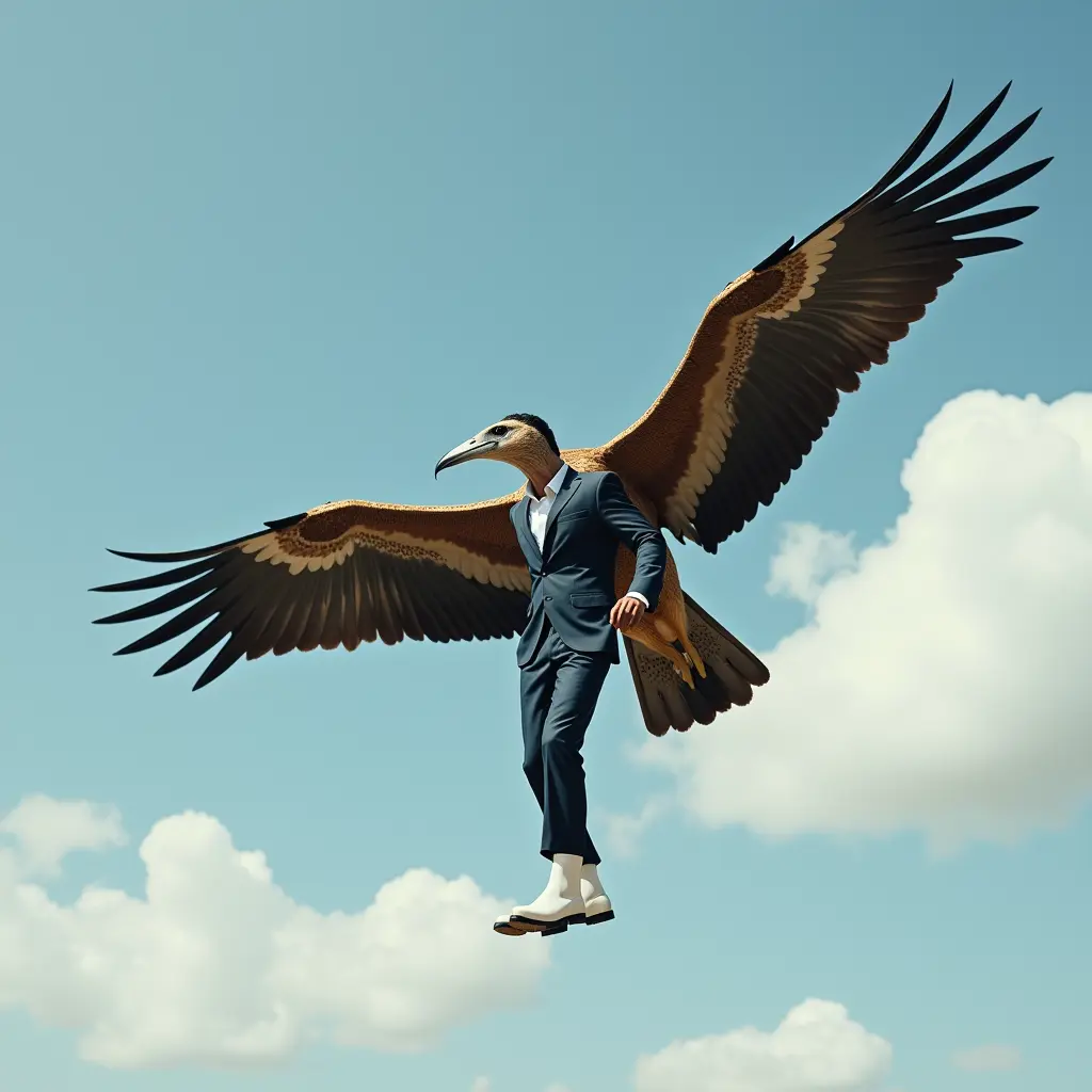 عصفور كبير يطير في السماء و في منقاره رجل يلبس طقم رسمي وبوط لونه ابيض