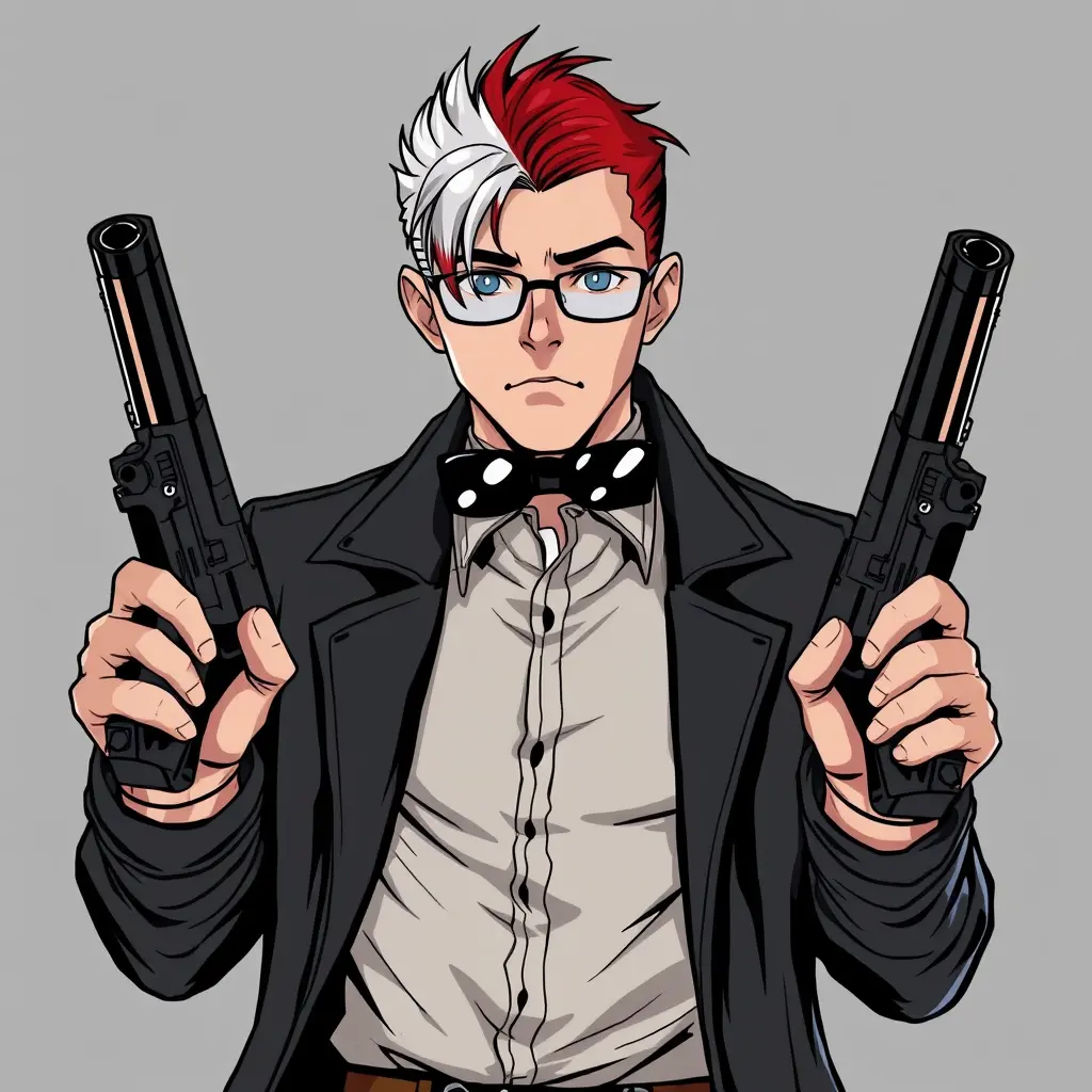 شخصية جاسوس متخفي يحمل مسدسان يرتدي نضاره وشعره ابيض بأحمر
