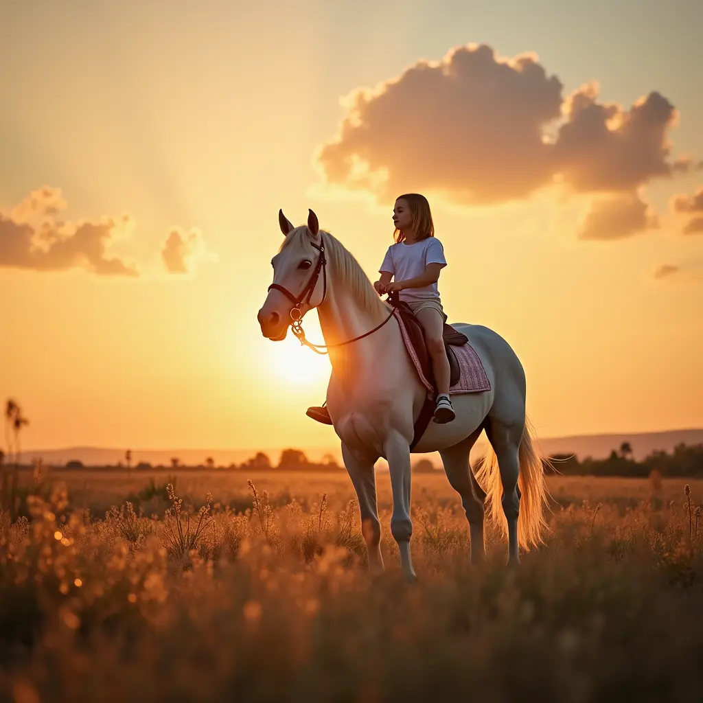 خلفيه فخمه هادئه بها حصان لونه أبيض وفي وقت ألغروب وبنت صغيره تركب علي ألحصان