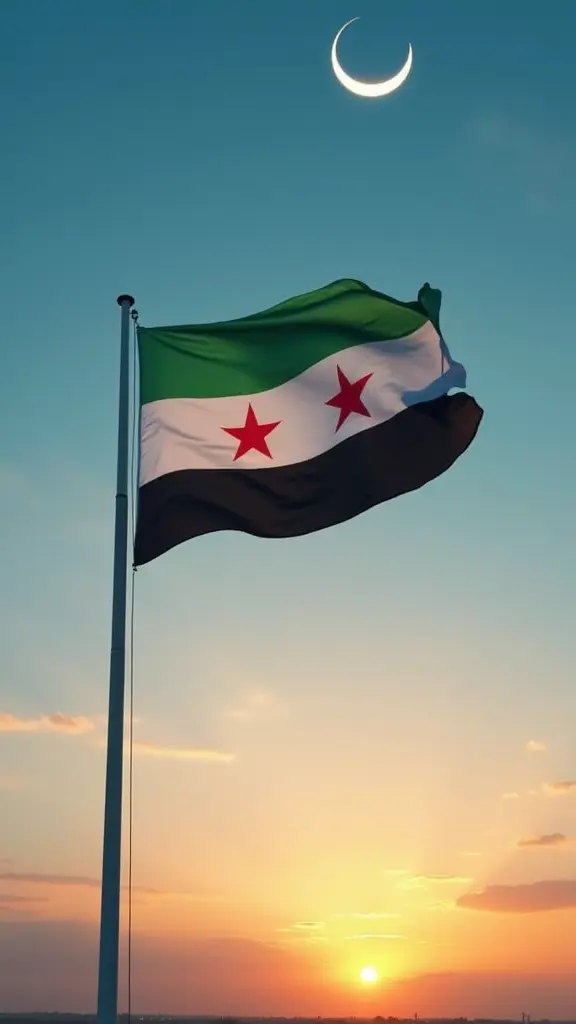 علم سوريا الحرة علم يتكون من ثلاثة أشرطة أفقية: الشريط العلوي أخضر، الشريط الأوسط أبيض يحمل ثلاث نجوم حمراء، والشريط السفلي أسود.  العلم يرفرف عالياً في السماء مع خلفية غروب الشمس التي تضفي جواً من الشاعرية والمشاعر الوطنية. تظهر السماء متدرجة الألوان بين الأزرق والبرتقالي، مع وجود الهلال فوق المشهد، مما يضيف لمسة رمزية تعكس الأمل والتحدي.