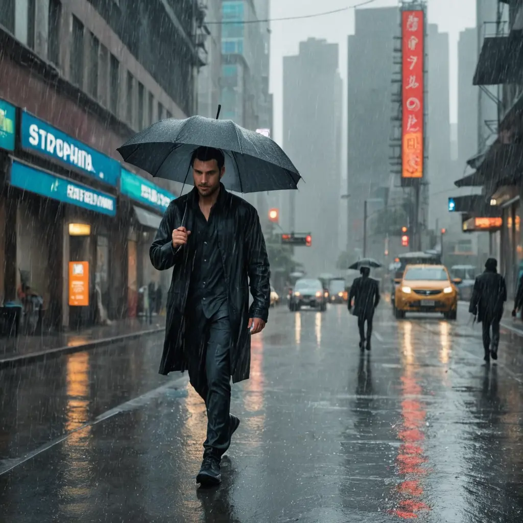 رجل يمشي تحت المطر في مدينة في العالم عام 2050