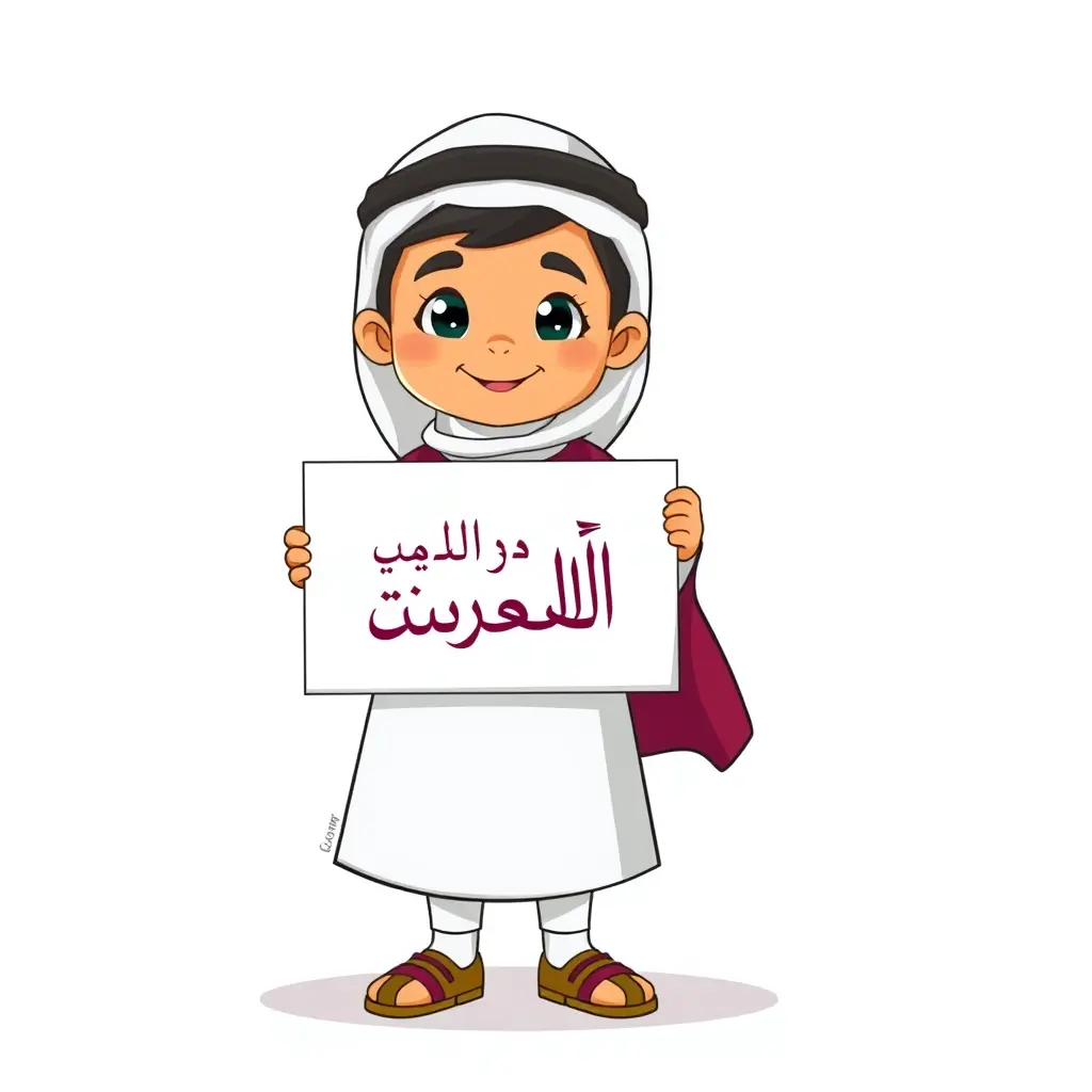 طفل قطري يرتدي الزي القطري التقليدي، بما في ذلك الدشداشة والغترة والعقال ، يقف بثقة ويده تحمل لوحة بيضاء كُتبت عليها عبارة "أهلاً بكم في قطر" بالخط العربي. صُوّر المشهد بأسلوب كرتوني نابض بالحياة، بألوان جريئة وملامح معبرة، مُجسّداً سلوك الطفل المرح والفخور على خلفية نظيفة.