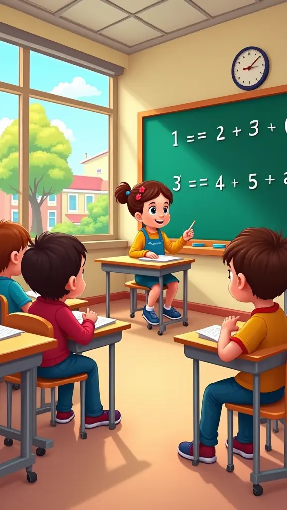 صورة كرتونية لقسم في مدرسة ابتدائية، أطفال يجلسون على مقاعد الدراسة، أمامهم كراريس، و في الأمام سبورة خضراء عليها أرقام وعمليات جمع، وتظهر عبر النافذة ساحة المدرسة، و الجدران مزينة بألوان جميلة