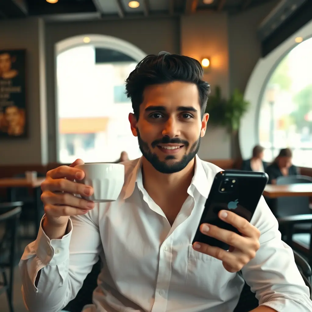 يوسف يجلس في مقهى وفي يده كوب قهوة ويرتدي قميص ابيض ويمسك هاتف ابل في يده الاخري