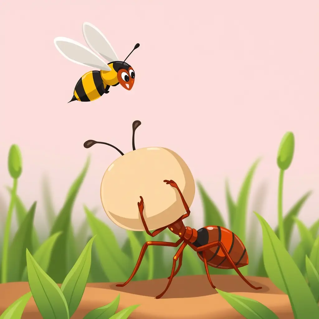 نملة شايلة حبة كبيرة ونحلة طايرة فوقها وبتتكلم معاها باسلوب كرتون والنملة بين الزرع والنحلة بتبصلها من فوق الزرع بالوان زاهية