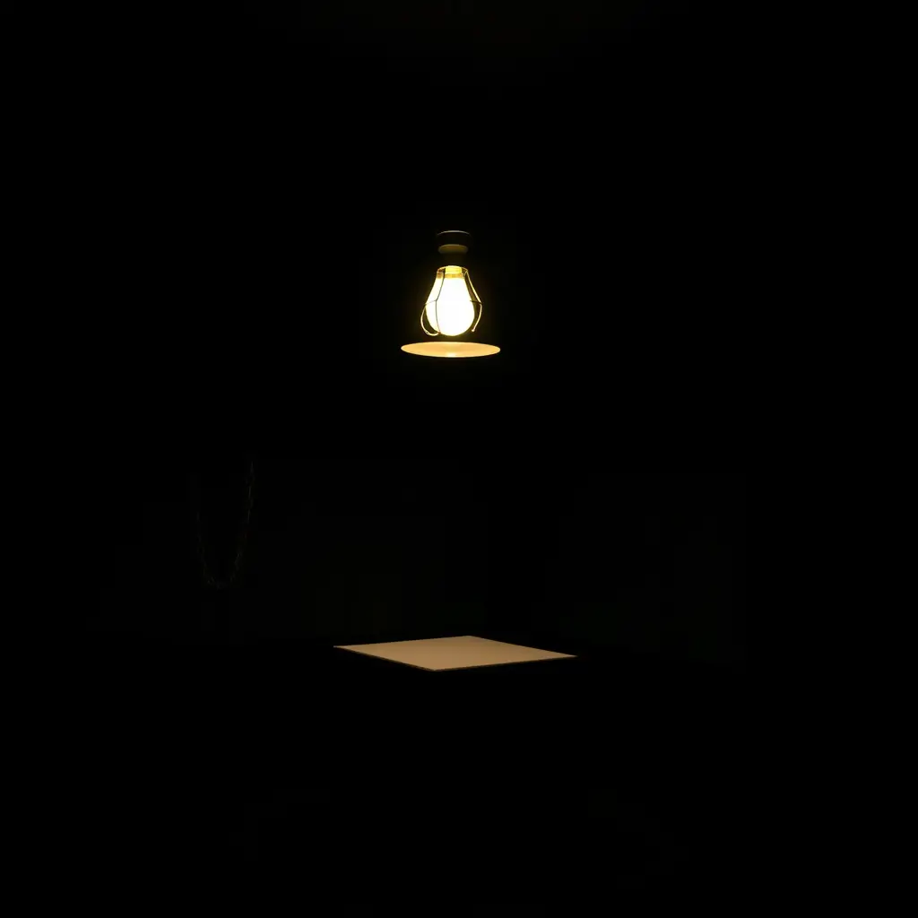 صوره لغرفه مظلمه بها مصباح معلق ينير ضوء خفيف و يوجد صندوق في الغرفه مسلسل بسلاسل معدنيه ثقيله و الصندوق يشع نور