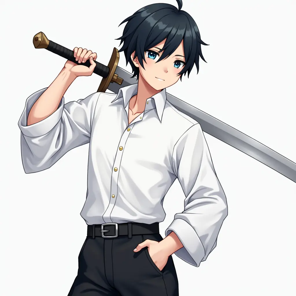 ولد انمي يرتدي قميس ابيض و سروال اسود ويحمل سيف الكتانة وشعره اسود و عيونها زرقاء