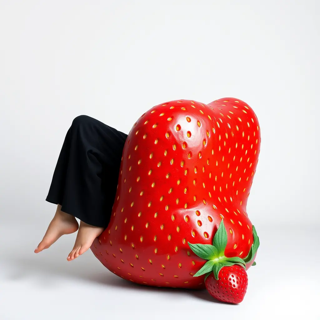 كرسي على شكل فراوله ماكول قدمه من الفراوله قاعد عليها شخص لابس باللون الاسود