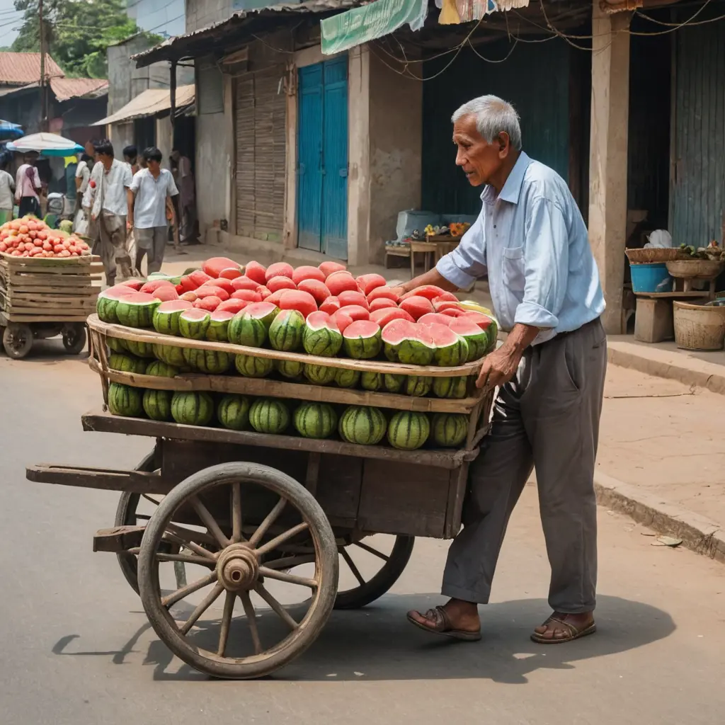 رجل كبير بالسن يدفع عربة يبيع بها البطيخ