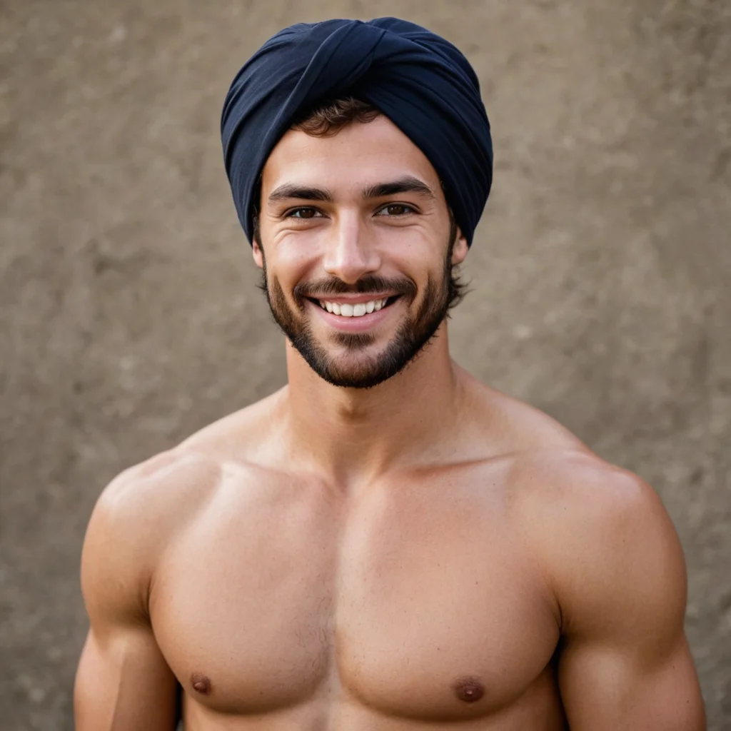 شاب اسمراني وسيم مع شعر مجعد بني قصير وعيون عسليه مع لحيه متوسطه وابتسامه عريضه جذابه مع غمازات طويل القامه مع جسد عضلي معتدل ويرتدي عمامه
