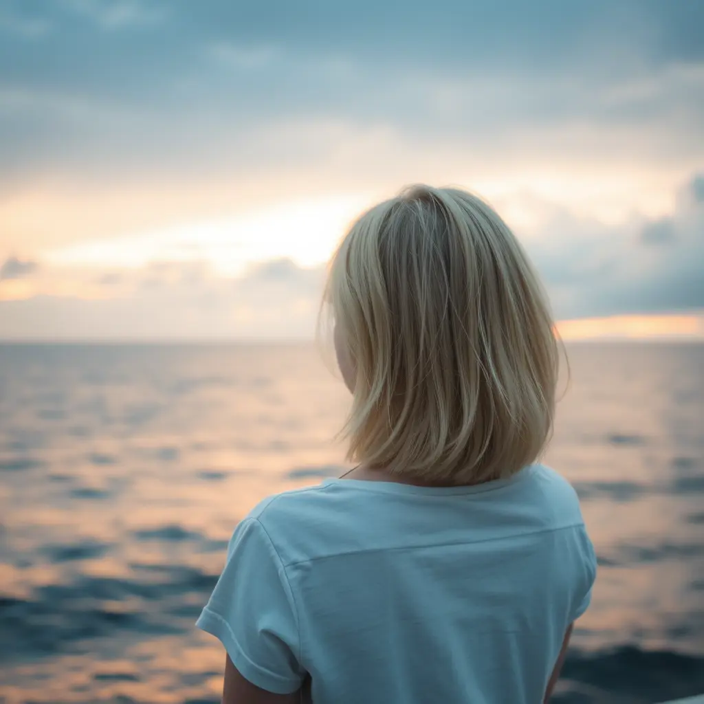 بنت شقراء بيضاء متوسط طول الشعر تطلع على البحر بدون اظهار وجهها والجو غيم بين الغروب والليل