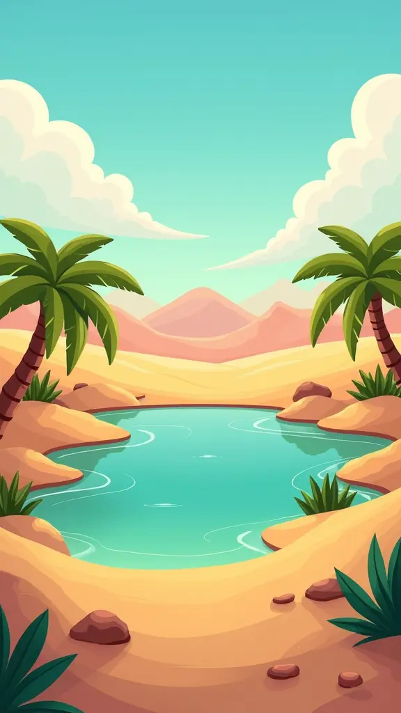 صوره كارتونيه صحراء مع واحه واشجار النخيل وبركة ماء