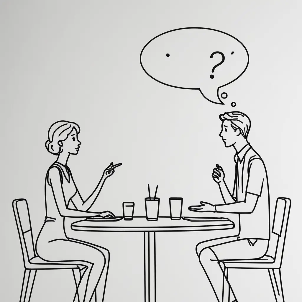 简笔线条画,2个火柴人的形象,整体画面越简单越好。一男一女,他们正在进行一场对话,他们坐在桌子两旁,男人问了一个问题,用冒泡符号表示这个问题;女人人表示很惊讶,用惊讶和疑惑的表情展示出来