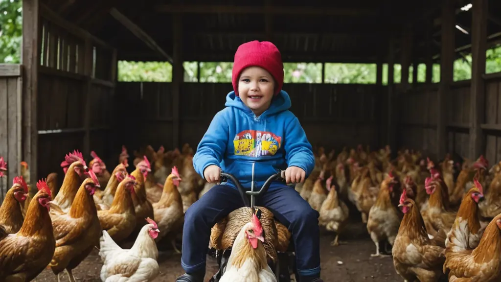 صوره طفل يركب دجاجه داخل مزرعه الدجاج